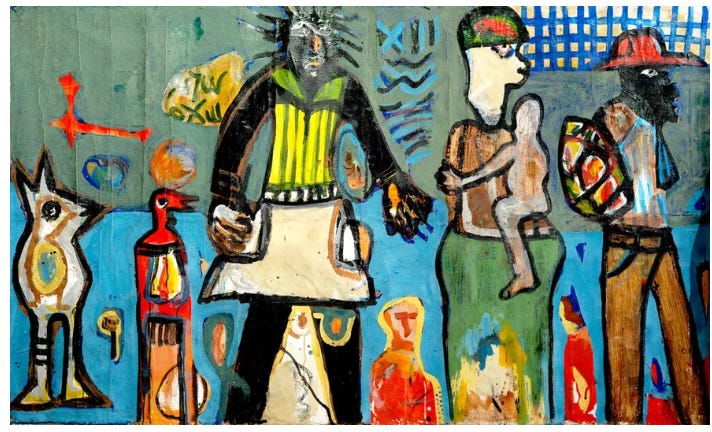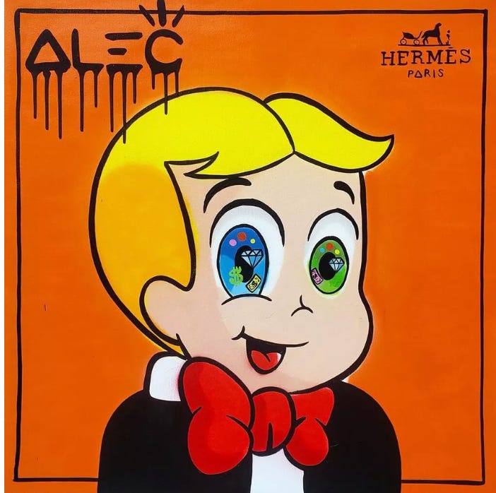The other type of popular, contemporary art is what I call “art that looks like shit.” ATLLS is a big tent, including artists who are just obviously grifting off one thing over and over (think those weird monopoly men that are in every single gallery in London and New York), to the “tragic immigrants journey” trying to make a leftist political point by painting in period blood or whatever. Neither look remotely good. No, spray-painting dollar signs onto an oil painting of Donald Duck isn’t art, and yes I get that its a critique of consumerism or whatever but it is so, so tired at this point to make something ugly and pretend its subversive, and then sell it for five figgies in a neighborhood where a one-bedroom walkup rents for $5k/month. No, shoving a paintbrush up your ass instead of holding it in your hand isn’t a new movement, it’s just pathological.5 Find a new artist who isn’t Basquiat to knock off, please! A few examples of ATLLS: